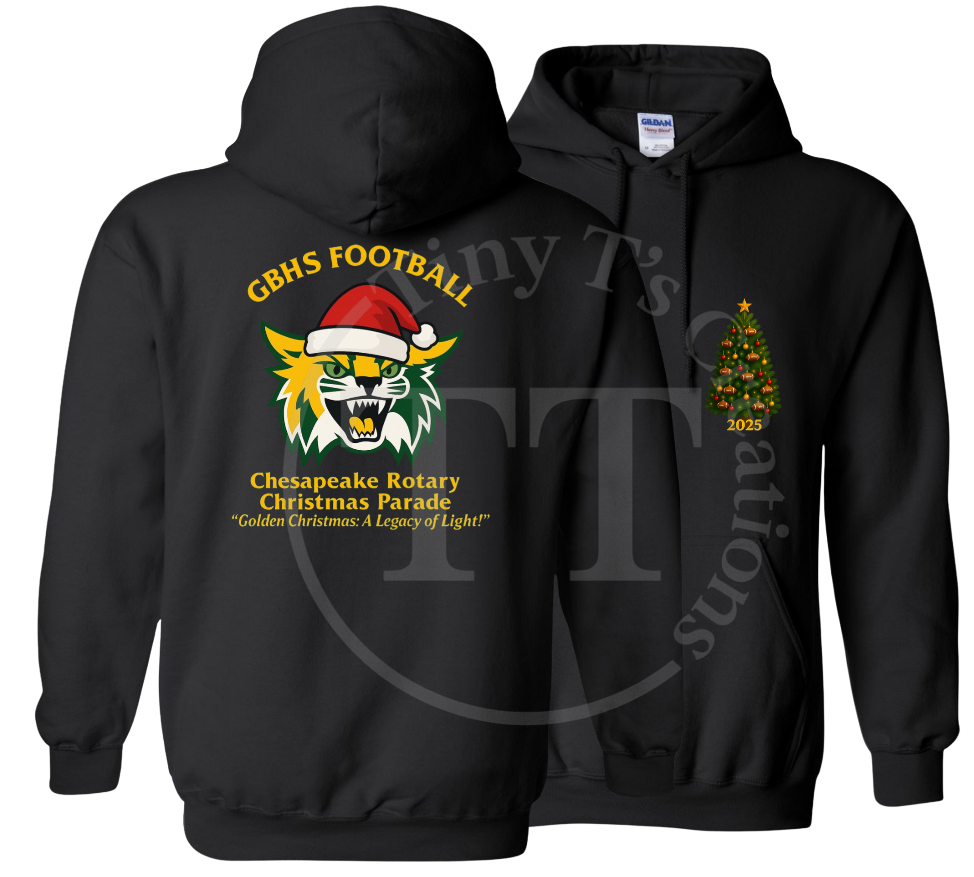Custom GBHS 2025 Chesapeake Rotary Christmas Parade Apparel. All tops are Black to better showcase the graphics. All Adult Long-Sleeved Shirts, Sweatshirts, and Hoodies are Unisex sizing